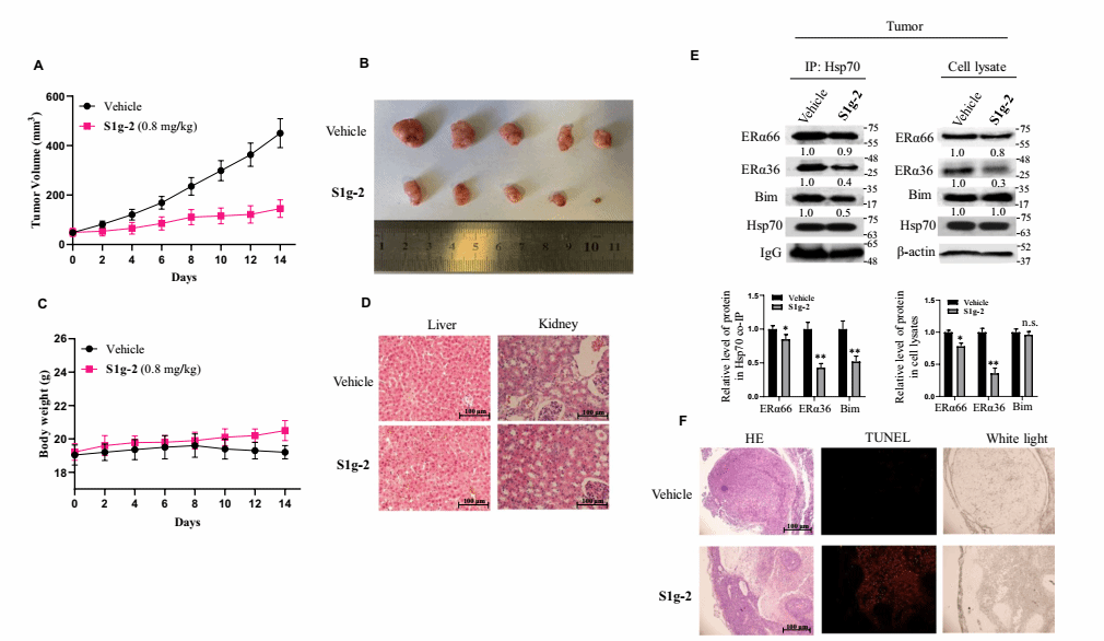 研究团队利用生物信息学研究发现,Hsp70是ERα互作蛋白组中含量最大的分子伴侣蛋白,其在乳腺癌中的表达显著高于正常乳腺组织,且与乳腺癌患者接受治疗的生存期显著相关。但是,Hsp70是一个具有重要生理功能的分子伴侣蛋白,直接针对Hsp70会有对正常细胞的毒性作用。张志超教授团队长期致力于研究Bcl-2家族蛋白在肿瘤中的功能意义,发现并证明Hsp70蛋白是泛Bcl-2家族成员,能够招募Bim蛋白作为其辅助伴侣蛋白,并研发了首个Hsp70-Bim蛋白蛋白相互作用的抑制剂分子S1g-2。S1g-2在多种肿瘤中的凋亡表型研究显示,其在他莫昔芬耐药的乳腺癌细胞中具有高于非耐药的乳腺癌的凋亡诱导活性。通过细胞生物学、生物化学等多种手段证实Bim辅助Hsp70的构象变化,显著增强Hsp70与ERα36的亲和力,而对其与ERα66的亲和力影响不大,S1g-2通过解离Hsp70和Bim的相互作用,破坏了Hsp70与ERα36的互作,导致ERα36降解。动物实验证明,耐药乳腺癌荷瘤小鼠在接受0.8 mg/kg剂量S1g-2腹腔注射治疗14天后,瘤体积缩小70%,S1g-2在体内通过解离Hsp70-Bim-ERα36蛋白复合物,诱导肿瘤组织组织显著凋亡。不出所料,S1g-2特异性靶向Hsp70与辅伴侣蛋白的互作,而非Hsp70的整体功能,因此加药组小鼠体重无明显变化,肝肾切片染色结果显示无明显毒性。S1g-2是全新结构、全新机制的逆转乳腺癌他莫昔芬耐药的抗癌先导药物分子。同时,Hsp70/Bim二聚体在他莫昔芬耐药的乳腺癌中的分子机制和靶标意义被阐释。